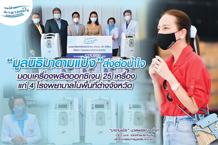 “มูลนิธิมาดามแป้ง” ภายใต้การดำเนินงานของ “มาดามแป้ง” นางนวลพรรณ ล่ำซำ ประธานกรรมการมูลนิธิฯ มอบเครื่องผลิตออกซิเจนจำนวน 25 เครื่อง แก่ 4 โรงพยาบาลในพื้นที่ต่างจังหวัด ซึ่งเป็นการสนับสนุนอุปกรณ์จำเป็นทางการแพทย์ เพื่อช่วยเหลือ และบรรเทาปัญหาอุปกรณ์การแพทย์ขาดแคลนในโรงพยาบาลต่างจังหวัดจากการรับมือสถานการณ์โควิด-19 โดยมี ร้อยเอกหญิงชญาดา หนีพาล กรรมการและเหรัญญิกมูลนิธิฯ เป็นผู้แทนมอบ พร้อมด้วย นายแพทย์ ศุภพงศ์ ไชยมงคล ผู้อำนวยการโรงพยาบาลคอนสาร จังหวัดชัยภูมิ และ แพทย์หญิง ดวงพร อัศวราชันย์ ผู้อำนวยการโรงพยาบาลอ่างทอง รับมอบเมื่อวันอังคาร ที่ 22 กุมภาพันธ์ 2565 ณ ห้องประชุม ชั้น 28 เมืองไทยประกันภัย