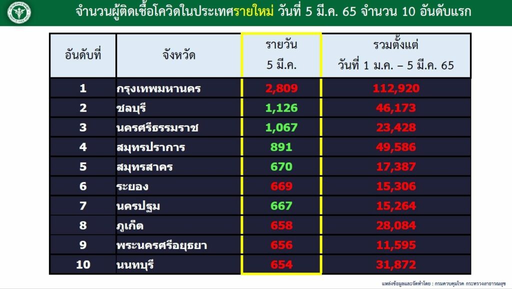 จำนวนผู้ติดเชื้อรายใหม่ 10 อันดับแรก คือ 1.กรุงเทพมหานคร 2,809 ราย 2.ชลบุรี 1,126 ราย 3.นครศรีธรรมราช 1,067 ราย 4.สมุทรปราการ 891 ราย 5.สมุทรสาคร 670 ราย 6.ระยอง 669 ราย 7.นครปฐม 667 ราย 8.ภูเก็ต 658 ราย 9.พระนครศรีอยุธยา 656 ราย และ10.นนทบุรี 654 ราย