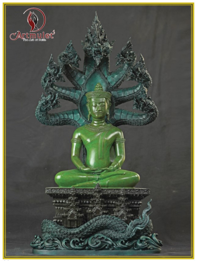สำหรับในสัปดาห์นี้ผมจะขอย้อนกลับมากล่าวถึงเรื่องราวของผลงานประติมากรรมองค์ก่อนหน้าอันเป็นงานประติมากรรมศิลปะขอมหรือบายนเช่นเดียวกัน พระพุทธปฏิมากรอันมีพระนามว่า “พระชัยพุทธมหานาถ” วัดขุนอินทประมูล จ.อ่างทอง อันเป็นพระพุทธรูปนาคปรกที่มีพญานาค ๗ เศียร ซึ่งการนำมากล่าวกันอีกในครั้งนี้เนื่องจากผู้เขียนเองมีเจตนาจะนำภาพผลงานประติมากรรมที่ได้หล่อองค์ตัวอย่างสำเร็จแล้ว ซึ่งมีความงดงามประณีต วิจิตร บรรจงเป็นอย่างมาก มาให้ท่านผู้อ่านและผู้ที่ได้ติดตามรอชมผลงานประติมากรรมของพระพุทธรูปองค์นี้ได้เห็นโดยทั่วกัน ส่วนเรื่องราวและเนื้อหาที่มาก็ยังคงเป็นเนื้อหาเดิม ดังนั้นสำหรับท่านที่เคยได้อ่านผ่านตามาบ้างแล้วก็ชมกันแต่ภาพนะครับแต่สำหรับท่านที่เพิ่งเข้ามาติดตามก็ขอแนะนำให้อ่านเนื้อหาควบคู่ไปด้วย จะได้รับทราบถึงรายละเอียดและที่มาของการจัดสร้างอันจะทำให้เห็นถึงคุณค่าของผลงานประติมากรรมอันทรงคุณค่าที่เกี่ยวข้องกับจิตวิญญาณของมวลมนุษย์ชาติตั้งแต่ครั้งอดีตจวบจนถึงปัจจุบันอันเป็นที่มาของชื่อคอลัมน์ “ศิลปะแห่งศรัทธา”