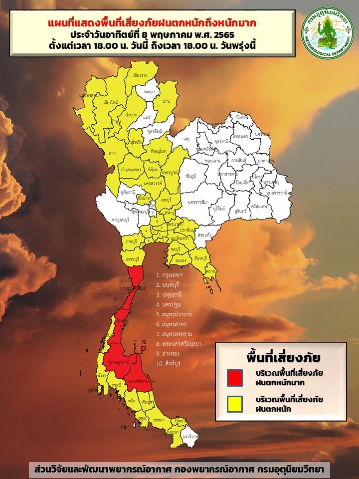 นอกจากนี้ กรมอุตุนิยมวิทยา ได้เปิดเผยแผนที่แสดงพื้นที่เสี่ยงภัยฝนตกหนักถึงหนักมาก ประจำวันอาทิตย์ที่ 8 พ.ค. 2565 ตั้งแต่เวลา 18.00 น. วันนี้ ถึงเวลา 18.00 น. ของวันพรุ่งนี้