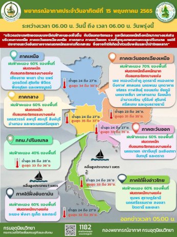 15 พ.ค. 2565 – กรมอุตุนิยมวิทยา รายงานลักษณะอากาศทั่วไป พยากรณ์อากาศ 24 ชั่วโมงข้างหน้า บริเวณความกดอากาศสูงหรือมวลอากาศเย็นจากประเทศจีนได้แผ่ลงมาปกคลุมประเทศลาวตอนบนแล้ว คาดว่าจะแผ่ลงมาปกคลุมภาคตะวันออกเฉียงเหนือและทะเลจีนใต้ในวันนี้ (15 พ.ค.) ประกอบกับมรสุมตะวันตกเฉียงใต้ที่พัดปกคลุมประเทศไทย ทะเลอันดามัน และอ่าวไทย มีกำลังปานกลาง ลักษณะเช่นนี้ทำให้บริเวณประเทศไทยตอนบนจะมีฝนฟ้าคะนองเพิ่มขึ้น กับมีลมกระโชกแรง และมีฝนตกหนักถึงหนักมากบางแห่งในบริเวณภาคเหนือ ภาคตะวันออกเฉียงเหนือ ภาคกลาง ภาคตะวันออก รวมทั้งกรุงเทพมหานครและปริมณฑล ขอให้ประชาชนระวังอันตรายจากฝนตกหนักและฝนที่ตกสะสม ซึ่งอาจทำให้เกิดน้ำท่วมฉับพลันและน้ำป่าไหลหลาก สำหรับคลื่นลมบริเวณทะเลอันดามันและอ่าวไทยมีคลื่นสูงประมาณ 1 เมตร บริเวณที่มีฝนฟ้าคะนองคลื่นสูงมากกว่า 1 เมตร ขอให้ชาวเรือในบริเวณดังกล่าวเดินเรือด้วยความระมัดระวังบริเวณที่มีฝนฟ้าคะนองไว้ด้วย