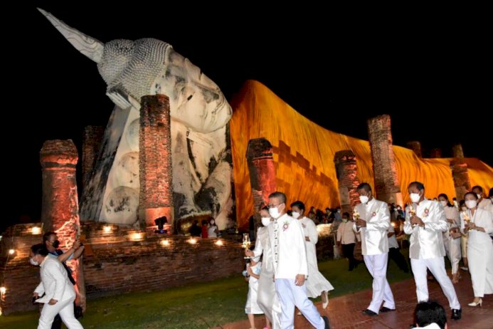 เมื่อเวลา 18.30 น.วันที่ 15 พฤษภาคม 2565 ที่วัดขุนอินทประมูล พุทธมณฑลจังหวัดอ่างทอง อ.โพธิ์ทอง จ.อ่างทอง นายวีระศักดิ์ วิจิตร์แสงศรี ผู้ว่าราชการจังหวัดอ่างทอง พร้อมด้วยนางชุติพร วิจิตร์แสงศรี นายกเหล่ากาชาดจังหวัดอ่างทอง นายประสพ เรียงเงิน หัวหน้าผู้ตรวจราชการกระทรวงวัฒนธรรม นางสาวเอกรัตน์ นาคาคง นายศักดิ์ดา บรรดาศักดิ์ รองผู้ว่าราชการจังหวัด นางวันทนีย์ มีแสง วัฒนธรรมจังหวัดอ่างทอง ข้าราชการ พ่อค้าแม่ค้า ประชาชน นักเรียน นักศึกษา ได้ร่วมกันฟังธรรมรักษาศีลแสดงตนเป็นพุทธมามกะ พร้อมด้วยการห่มผ้าองค์พระนอนพุทธไสยยาสน์ และเวียนเทียน เนื่องในวันมาขบูชา เพื่อสืบทอดพระพุทธศาสนาและเป็นสิริมงคลแก่ครอบครัว