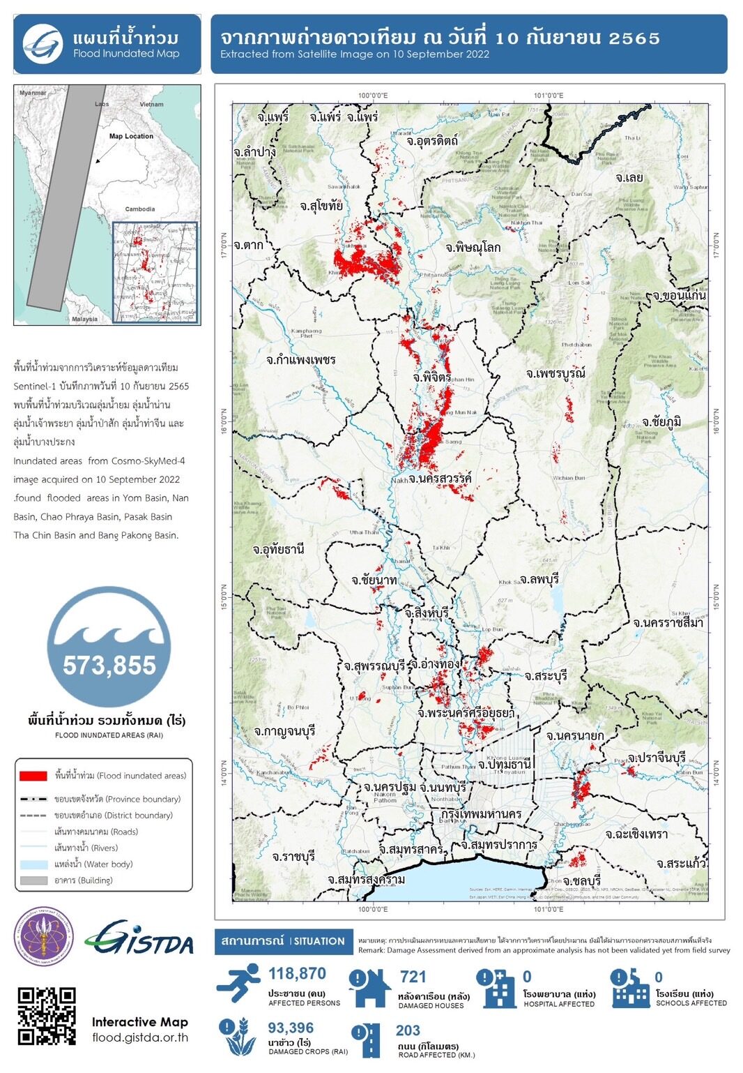 เมื่อวันที่ 11 กันยายน สำนักงานพัฒนาเทคโนโลยีอวกาศและภูมิสารสนเทศ (องค์การมหาชน) หรือ GISTDA เปิดเผยว่า GISTDA ใช้ดาวเทียม Sentinel-1 ของวันที่ 10 กันยายน ติดตามสถานการณ์น้ำท่วม ล่าสุดพบพื้นที่น้ำท่วมขังแล้ว จำนวน 573,855 ไร่ ในหลายพื้นที่ของลุ่มน้ำยม ลุ่มน้ำน่าน ลุ่มน้ำเจ้าพระยา ลุ่มน้ำป่าสัก ลุ่มน้ำท่าจีน ลุ่มน้ำบางปะกง ได้แก่