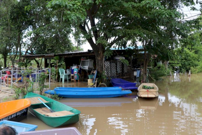 วันนี่( 3 ต.ค.) ที่บริเวณริมถนนศาลาแดง หมู่ 4 ตำบลโผงเผง อำเภอป่าโมก จังหวัดอ่างทอง พบร้านข้าวขาหมู ก๋วยเตี๋ยว ที่ปรับตัวขาย สู้กับน้ำที่ท่วมเอ่อล้น เข้ามาภายในร้านแบบชิลๆ ส่วนลูกค้าก็ปรับตัวสู้ สั่งข้าวขาหมู และก๋วยเตี๋ยวนั่งกิน ที่โต๊ะหินที่น้ำท่วมสูงประมาณ 30เซนติเมตร กันทั้งครอบครัว พ่อแม่ลูก บอกอาหารอร่อยดี ฟินไปอีกแบบ ไม่พลาดต้องลองไป ที่โผงเผง นานๆจะมีสักที กินอาหารกลางน้ำ