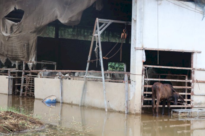 ชาวบ้านหมู่ 6 ตำบลราชสถิตย์ เร่งย้ายวัวกว่า100ตัวไว้ที่สูง หลังน้ำเอ่อล้นข้ามถนนไหลทะทักเข้าท่วม การไฟฟ้าเร่งตัดไฟ ชาวบ้านเร่งขนของหนีน้ำ