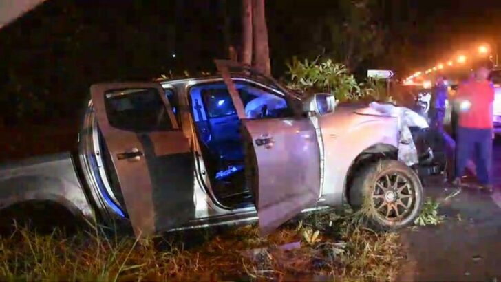ที่เกิดเหตุพบรถกระบะยี่ห้ออีซูซุ สีบรอนซ์ ทะเบียน กจ 9295 สิงห์บุรี จอดอัดติดอยู่กับต้นไม้ริมทาง สภาพด้านหน้าฝั่งขวาได้รับความเสียหาย มีเสาไฟฟ้าได้รับความเสียหายไปหนึ่งต้น