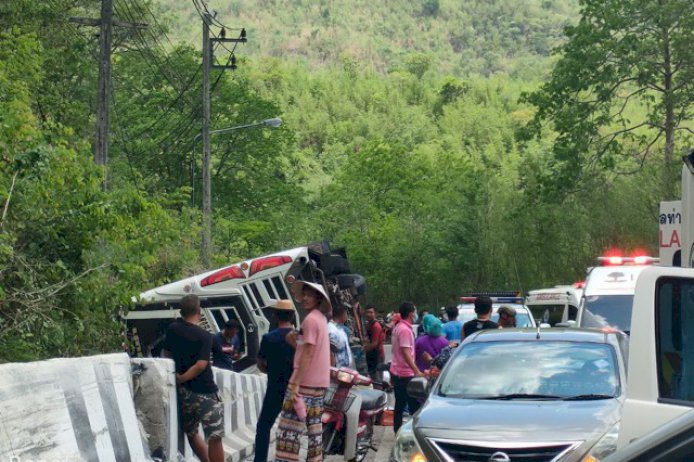 กาญจนบุรี – เจ็บเพิ่ม .. รถบัสคณะศึกษาดูงานจากจังหวัดอ่างทอง เบรคแตกหลุดโค้งช่วงทางลงเขาตับเต่าอำเภอศรีสวัสดิ์ พุ่งชนแนวกั้นข้างทางจนรถพลิกตะแคงฟาดกลับแนวภูเขา ส่งผลผู้โดยสารภายในรถเสียชีวิตคาที่ 2 ราย เจ็บระนาว 49 ราย สาเหตุไม่ชำนาญเส้นทาง
