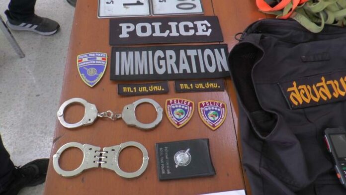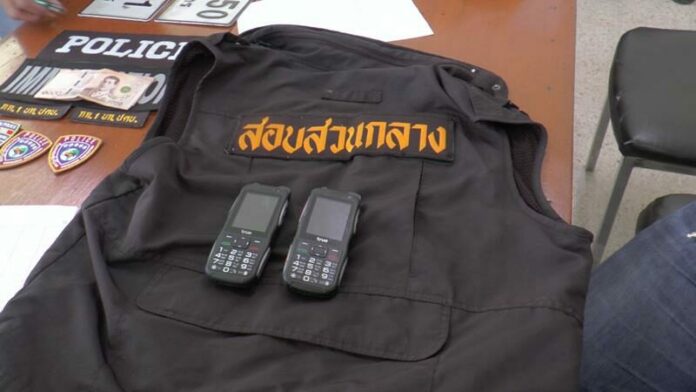 เบื้องต้นพบว่ามี 2 คน ที่ปลอมแปลงนำรูปหน้าของตนไปใส่ในบัตรประจำตัวข้าราชการตำรวจ ระบุตำแหน่ง ส.ต.ต. และ ส.ต.ท. สังกัด กก. อารักขา 1 บก.อคฝ. ส่วนชื่อนั้นไม่ตรงกับบัตรประจำตัวประชาชนที่ทั้ง 2 คนถืออยู่ ภายในรถยนต์กระบะพบเสื้อกั๊กปักด้านหลัง สอบสวนกลาง อาร์มตำรวจ กก. 1 บก.ปคบ. กุญแจมือ ป้ายทะเบียนรถ สายรัด และเงินสดจำนวนหนึ่ง เบื้องต้นทางเจ้าหน้าที่ตำรวจ ได้แจ้งข้อกล่าวว่า ใช้เอกสารข้าราชการปลอมและบัตรปลอม พร้อมขยายผลรอผู้ที่เสียหายมาทำการแจ้งความเพิ่มเติม
