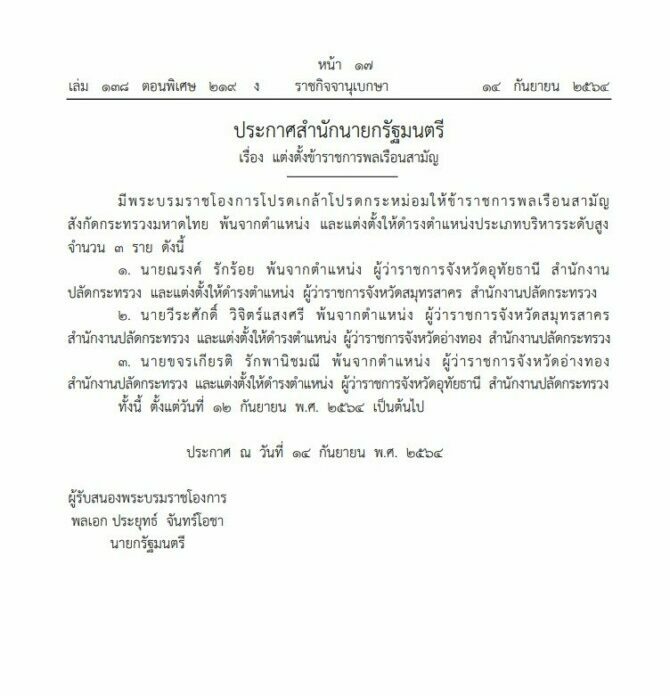 หลังจากเว็บไซต์ราชกิจจานุเบกษาเผยแพร่ ประกาศสำนักนายกรัฐมนตรี เรื่องแต่งตั้งข้าราชการพลเรือนสามัญ ความว่า มีพระบรมราชโองการโปรดเกล้าโปรดกระหม่อมให้ข้าราชการพลเรือนสามัญ สังกัดกระทรวงมหาดไทย พ้นจากตำแหน่ง และแต่งตั้งให้ดำรงตำแหน่งประเภทบริหารระดับสูง 3 ราย เมื่อวันที่ 15 ก.ย.ที่ผ่านมา ประกอบด้วย