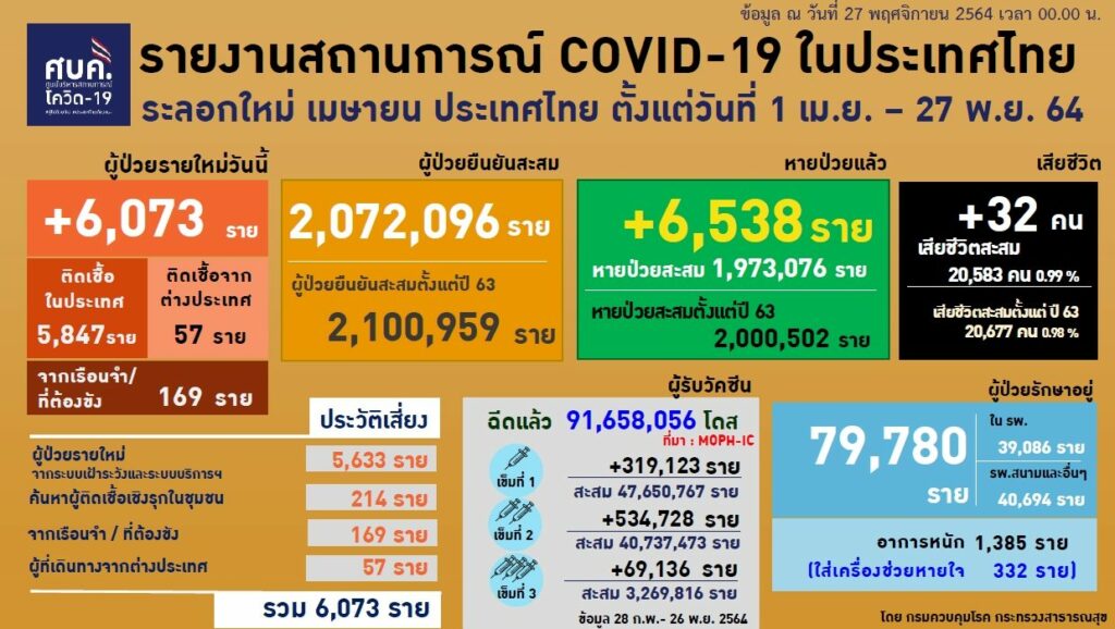 เมื่อวันที่ 27 พฤศจิกายน ผู้สื่อข่าวรายงานว่าศูนย์บริหารสถานการณ์การแพร่ระบาดโรคติดเชื้อไวรัสโคโรนา 2019 (โควิด-19) หรือศบค. รายงานสถานการณ์ประจำวัน ว่า วันนี้พบผู้ติดเชื้อรายใหม่ 6,073 ราย จำแนกเป็นผู้ติดเชื้อทั่วไปในประเทศ 5,847 ราย ติดเชื้อจากผู้เดินทางต่างประเทศ 57 ราย และติดเชื้อในเรือนจำ/ที่ต้องขังเพิ่ม 169 ราย ผู้ป่วยยืนยันสะสม 2,072,096 ราย ผู้ป่วยยืนยันสะสมตั้งแต่ปี 63 รวม 2,110,959 ราย หายป่วยเพิ่มวันนี้ 6,538 ราย หายป่วยสะสม 1,973,076 ราย หายป่วยยืนยันสะสมตั้งแต่ปี 63 รวม 2,000,502 ราย วันนี้มีผู้เสียชีวิต 32 ราย เสียชีวิตสะสม 20,583 ราย เสียชีวิตสะสมตั้งแต่ปี 63 รวม 20,677 ราย ส่วนผู้ป่วยรักษาอยู่ 79,780 ราย แบ่งเป็นรักษาในโรงพยาบาล 39,086 ราย โรงพยาบาลสนาม และอื่นๆ 40,694 ราย อาการหนัก 1,385 ราย และใส่เครื่องช่วยหายใจ 332 ราย