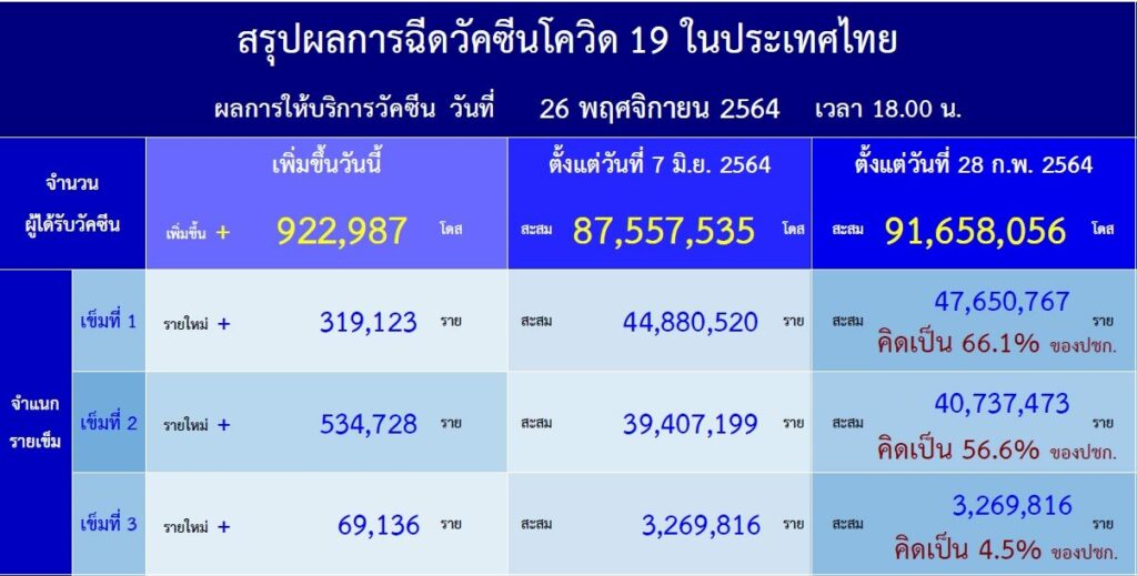จำนวนการได้รับวัคซีน โควิด-19 แยกตามกลุ่มเป้าหมาย ตั้งแต่วันที่ 28 กุมภาพันธ์ ถึง 26 พฤศจิกายน 2564 ได้แก่ 1.บุคลากรทางการแพทย์และสาธารณสุข เข็มหนึ่ง 876,287 ราย (123.1%) เข็มสอง 852,428 ราย (119.7%) และเข็มสาม 669,001 ราย (94%) 2.เจ้าหน้าที่ด่านหน้า เข็มหนึ่ง 1,224,354 ราย (64.4%) เข็มสอง 1,166,905 ราย (61.4%) และเข็มสาม 371,145 ราย (19.5%) 3.อาสาสมัครสาธารณสุขประจำหมู่บ้าน เข็มหนึ่ง 778,932 ราย (77.9%) เข็มสอง 736,602 ราย (73.7%) และเข็มสาม 157,933 ราย (15.8%) 4.ผู้มีโรคเรื้อรัง 7 กลุ่มโรค เข็มหนึ่ง 4,693,531 ราย (73.9%) เข็มสอง 4,206,464 ราย (66.3%) และเข็มสาม 236,266 ราย (3.7%) 5.ประชาชนทั่วไป เข็มหนึ่ง 29,315,982 ราย (63.5% ) เข็มสอง 24,314,500 ราย (52.7%) และเข็มสาม 1,720,209 ราย (3.7%)